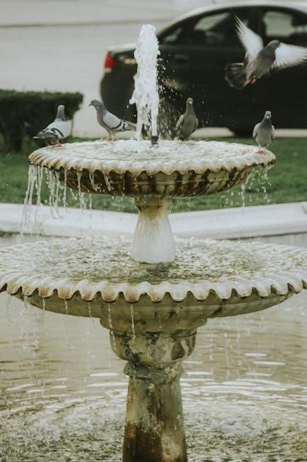 Ensure all electrical connections are tight and properly grounded to prevent electrical shock. Use appropriate wiring and connectors rated for the intended application. Inspect wiring for damage before making connections. Avoid overloading circuits. If the fountain’s power cord is damaged, it must be replaced by a qualified technician. Always test electrical functionality after installation to confirm proper operation and safety.
